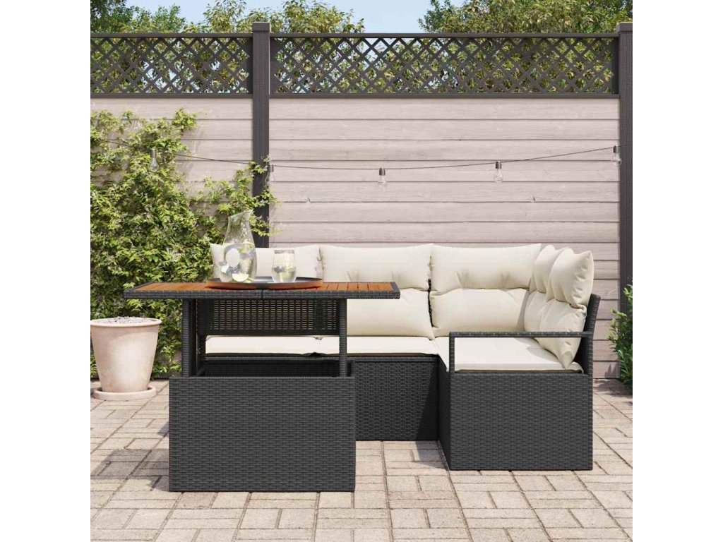 - Použité materiály: Sada je vyrobená z vysokokvalitného polyratanu, známeho svojou odolnosťou a vlastnosťami odolnými voči počasiu. Pevný stôl z akáciového dreva pridáva rustikálny šarm, doplnený robustným rámom z ocele s práškovou povrchovou úpravou, ktorý zabezpečuje odolnosť voči vonkajším prvkom.