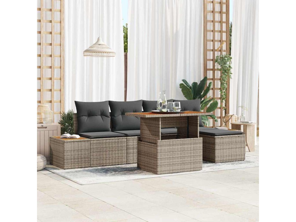 - Vynikajúce materiály: Vyrobená z poly ratanu, masívneho akáciového dreva a ocele s práškovou povrchovou úpravou, táto jedálenská súprava kombinuje krásu a odolnosť. Vynikajúca odolnosť voči UV žiareniu zabezpečuje dlhodobé uchovanie farby a minimálnu údržbu, čo ju robí ideálnou pre vonkajšie prostredia.