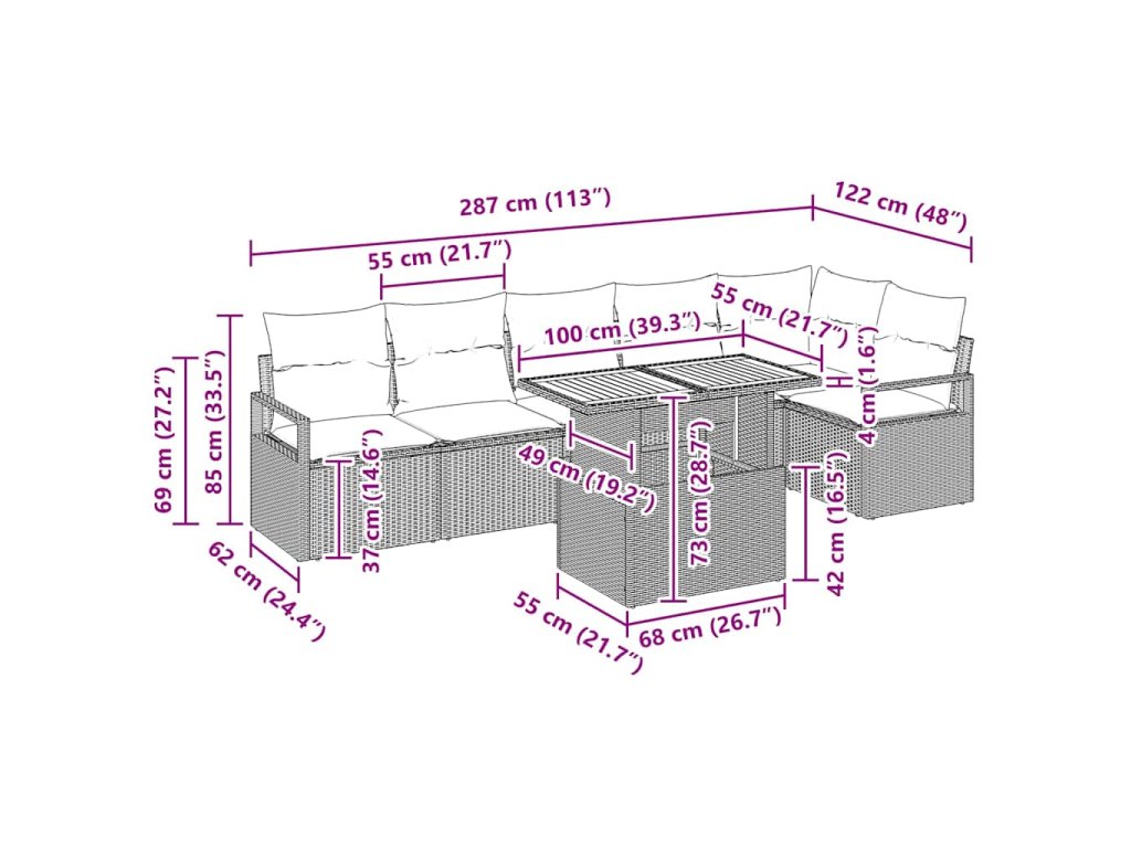 - Kompletný set: Obsahuje dva kreslá, jedno rohové sedenie, tri stredné sedenia a záhradný stôl, pričom každý kúsok je navrhnutý s vlastnými úložnými možnosťami. Tento set maximalizuje priestor a funkčnosť, ponúkajúci dostatok sedenia pre všetkých hostí a bezpečné skladovanie pre vankúše a doplnky.