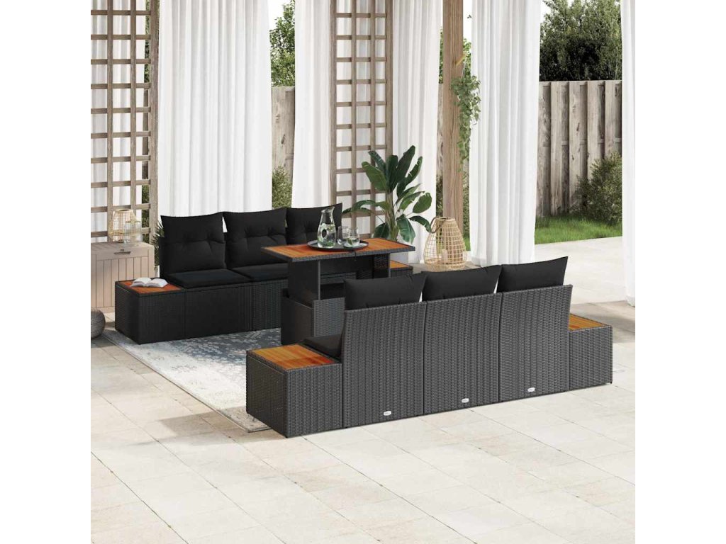 - Materiály: Vyrobené z kvalitného poly ratanu, tento set je odolný voči počasiu a má moderný vzhľad. Silný oceľový rám s práškovou úpravou zabraňuje hrdzaveniu, pričom povrchy z agátového dreva dodávajú pekný nádych a kombinujú trvácnosť s estetikou.