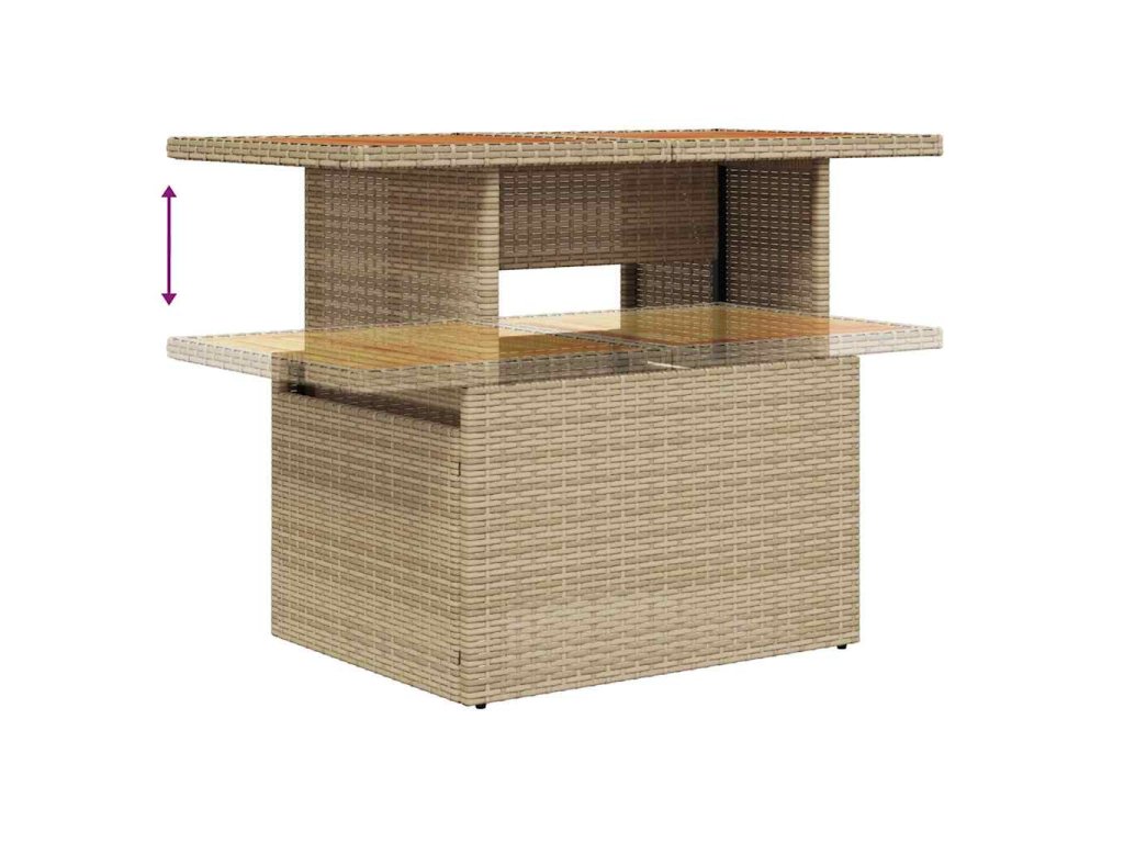 - Elegantný dizajn z poly ratanu Hlavná konštrukcia súpravy pozostáva z poly ratanu, známeho svojou odolnosťou voči UV žiareniu, čo zaisťuje trvácnosť a štýl počas rôznych sezón. Tento materiál poskytuje rafinovaný vzhľad a perfektne sa spojuje s modernou záhradnou estetikou, ponúkajúc útulné a štýlové prostredie na vonkajšie stolovanie a interakciu.