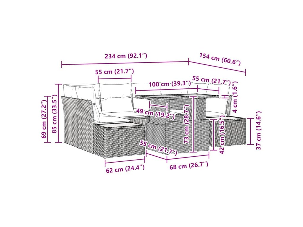 - Modulárne usporiadanie: Tato súprava obsahuje všestranné kusy, ktoré môžu byť prekonfigurované tak, aby vyhovovali vašemu priestoru, čo umožňuje optimálne sedenie. Prispôsobivosť je ideálna pre meniace sa potreby, ponúkajúca flexibilitu pri zábave alebo pri rodinných jedlách.
