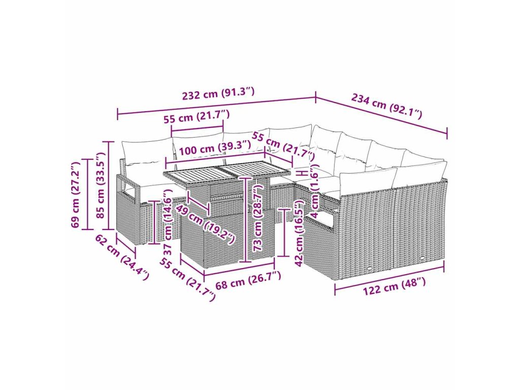 Táto súprava záhradného nábytku dodáva vášmu exteriéru moderný a praktický nádych. Má modulárny dizajn, takže si môžete prispôsobiť usporiadanie sedenia podľa vašich potrieb na terase alebo v záhrade. Obdĺžnikový tvar zdôrazňuje elegantné línie, čím vytvára krásne pohodlné usporiadanie. S príjemnou a pevným tkaním vytvára útulnú atmosféru vo vašich vonkajších priestoroch. Či už grilujete, užívate si večeru pri západe slnka, alebo sa bavíte s kamarátmi, tento flexibilný kúsok nábytku ponúka teplý a vítajúci priestor.