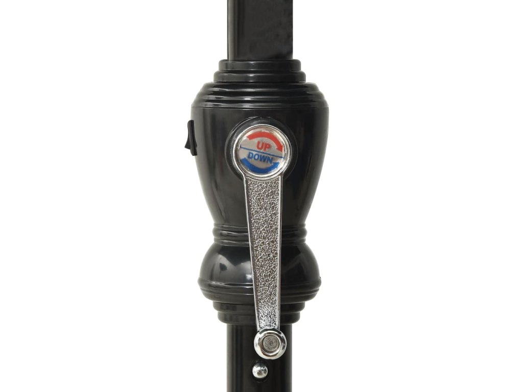 Vonkajší slnečník je vyrobený z polyesteru chrániaceho voči UV žiareniu a odolného voči vyblednutiu, a poskytne vám optimálnu ochranu pred slnkom. Stabilitu zaisťuje aj oceľová tyč a rebrá opatrené práškovým nástrekom. Vďaka kľuke a náklonu je skladací a prenosný. Môže byť pripevnený k existujúcemu stojanu alebo do stredu stola, ak je v ňom k dispozícii otvor. Integrované LED svetlá, ktoré sú napájané solárnym panelom, vytvoria v noci útulné a romantické prostredie.